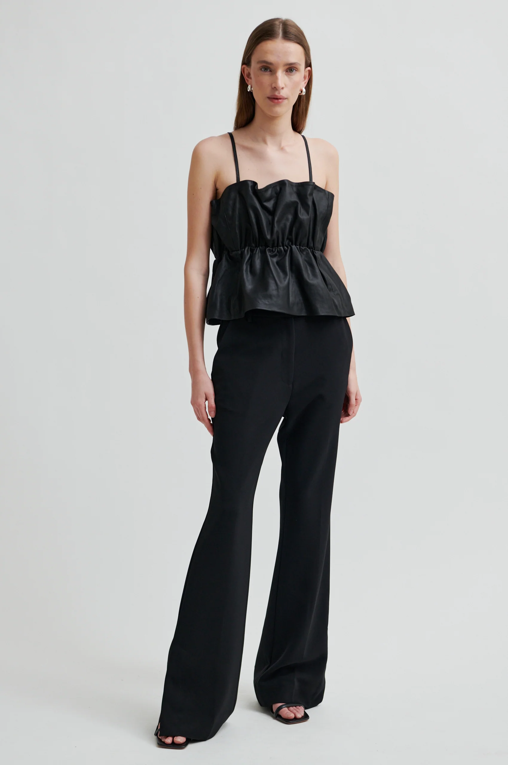 Second Female leather top. The top is made in smooth goat leather. Featuring thin adjustable straps and elasticated seam under the bust that creates sculptural effect. Fully lined. Regular fit.