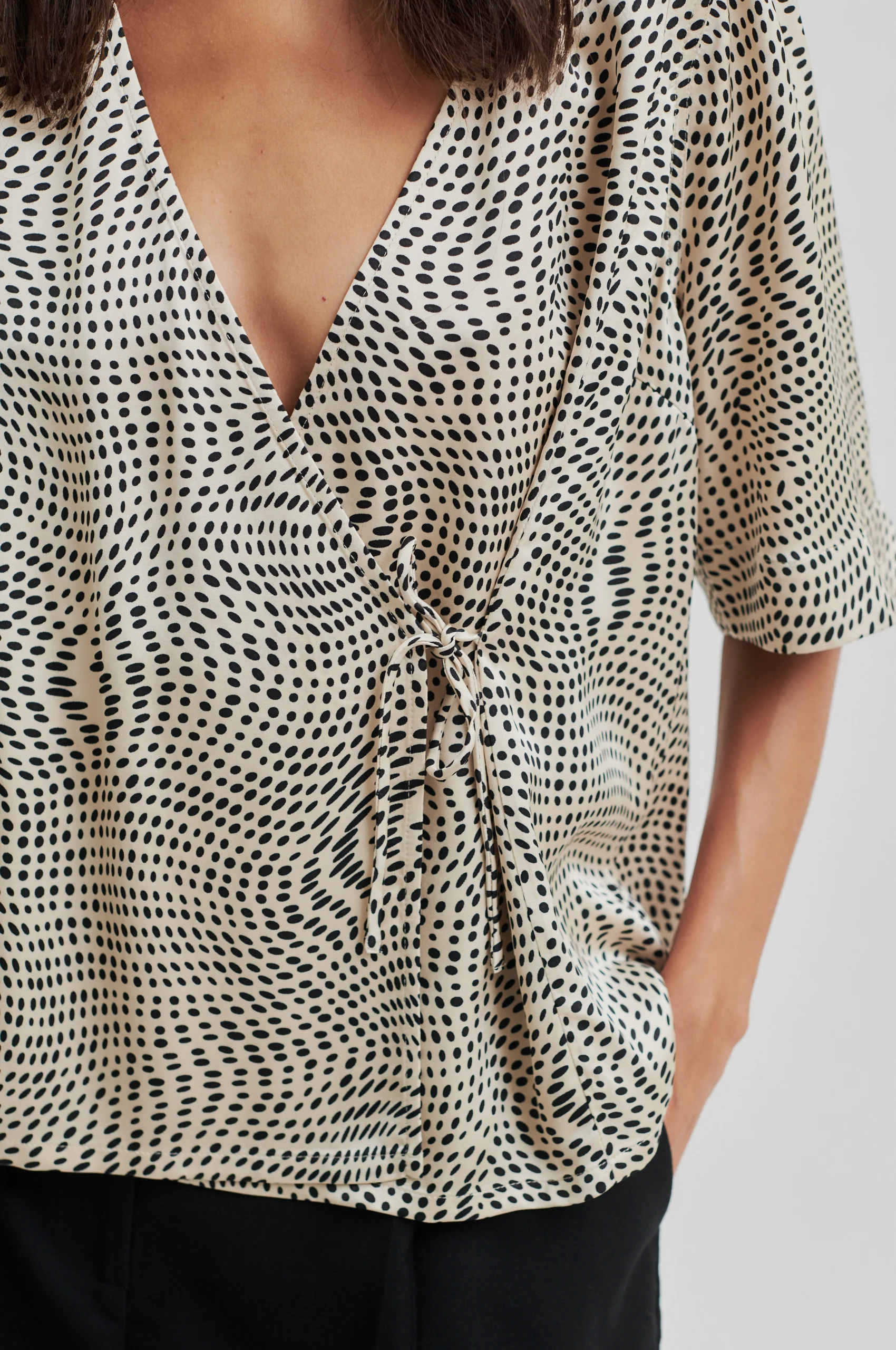 Second Female wrap-over blouse. The blouse is made in a soft, drapy viscose-blend with all-over pattern. Featuring a V-neck with cross-over front with ties that fasten at one side. Short sleeves with pleated details. Relaxed fit.