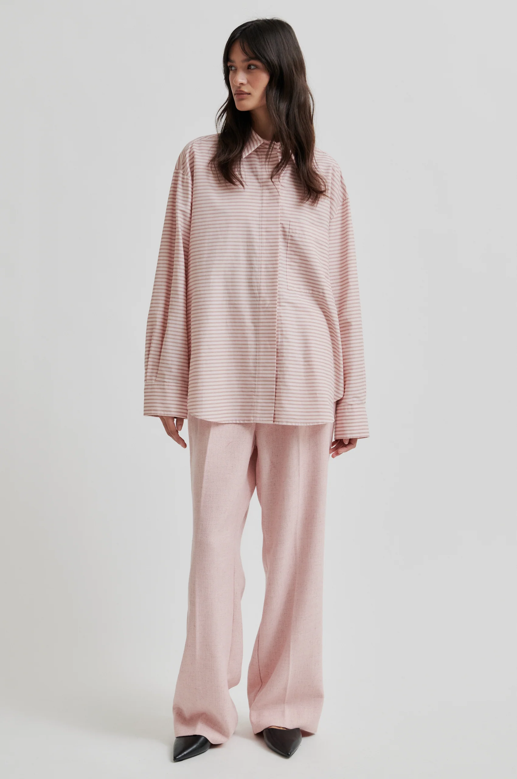 Second Female wide-leg trousers. The trousers are made in a melange fabric with linen quality. Featuring a concealed zip, hook and button closure, two front pockets and decorative back pockets. Pleats at waist. Mid waist with wide, straight legs.