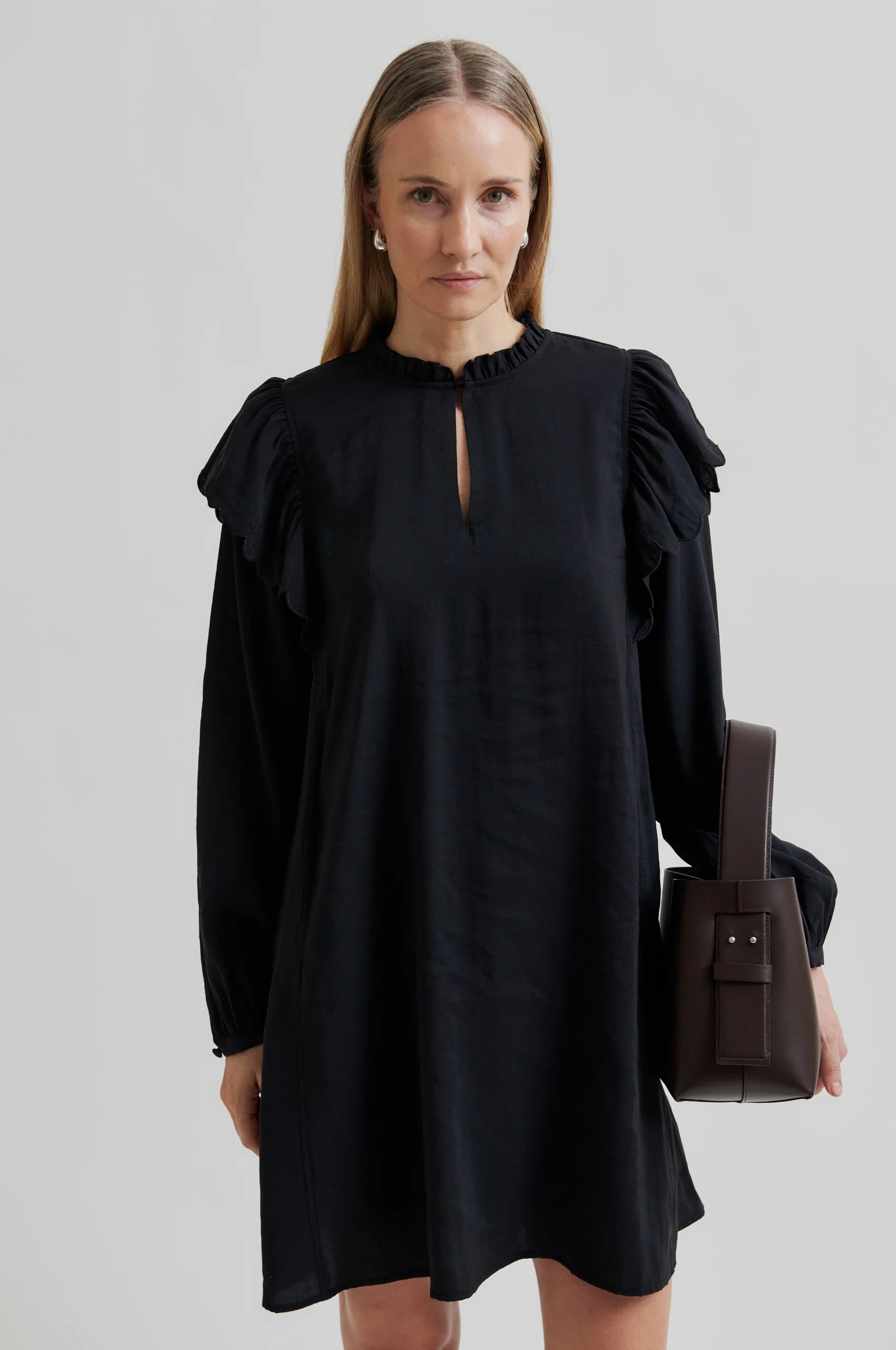 Second Female frilled long-sleeved dress. The dress is made in a soft, drapy modal blend. Featuring a round neck with frill trim and keyhole opening with button fastening. Overlapping frill detail at shoulders and long sleeves with buttoned cuffs. Two concealed pockets in side seams. Relaxed fit with straight silhouette.